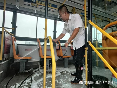 在清潔公交車外皮方面,以前的保潔員每刷一部車至少需要更換五桶水,換水、推水、刷洗這一整套操作流程下來,一輛車的外皮清理至少需要用15分鐘。五公司二隊為了提高清潔效率,歷時一個月經過多次發明創造、改良,終于將“移動噴刷一體式洗車機”自主研發成功!首先,他們將2厘米直徑的水管全部將洗刷公交車的長柄刷桿部套入,將刷頭和水管頭進行有效連接,將刷頭的刷毛進行裁剪至露出水管出水口。再次,他們將水管的另一端連接可移動電動抽水水泵,水泵開機后將水桶內的水進行抽取,水通過水管和刷柄連接縫隙進入刷頭,最終刷頭出現噴淋效果,讓公交車的清潔“樹上開花”!此項自主發明不僅達到了邊刷邊洗效果,還提高了清潔效率。五公司二隊的司機和保潔員也紛紛表示:現在刷一輛公交車的外皮只需要4分鐘,我們省力了,公交車也干凈了,真是一舉兩得!
